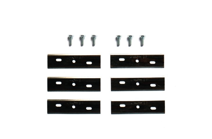 Ovaj komplet sadrži 6 (2x3) reznih noževa, viličasti ključ za otpuštanje pričvrsnih vijaka i zamjenske vijke. Noževi su kaljeni, dugotrajniji i tako dugotrajno osiguravaju ravnomjerno rezanje. Prikladan za sve modele.