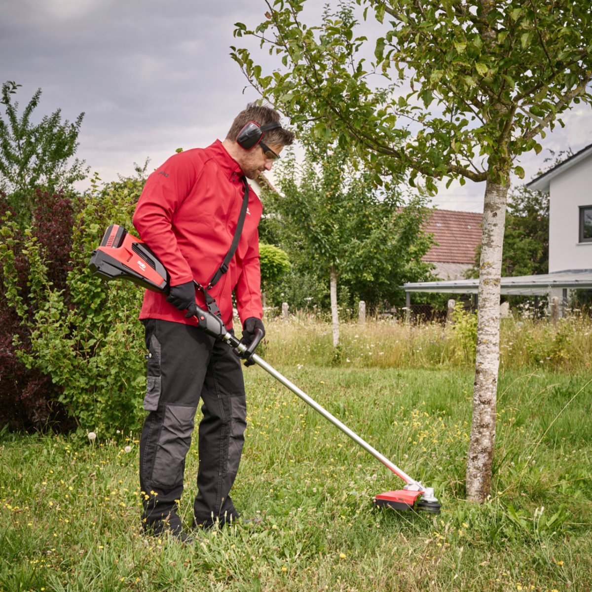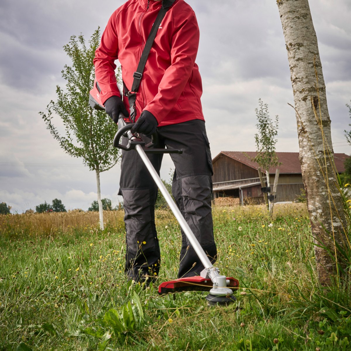 Jednostavno rukovanje zahvaljujući okrugloj ručki s graničnikom. Ova ručka smanjuje težinu u usporedbi s ručkom u stilu bicikla. Kako bi zaštitio vaš akumulatorski trimer, opremljen je gumenim odbojnikom. Svestrana upotreba zahvaljujući dvostrukoj reznoj glavi s reznom niti Fast&Easy (jednostavno uvlačenje i namatanje rezne niti bez otvaranja glave) sa širinom rezanja od 41 cm i promjerom od 2,4 mm, te nožem za košnju s 3 zuba (širina rezanja 25 cm). Lagana, ali vrlo čvrsta aluminijska cijev drške ima promjer od 26 mm. Radite u Eco načinu rada pri fiksnih 4400 o/min ili u načinu rada s promjenjivom brzinom između 3700 i 6000 o/min (ovisno o tome koliko snažno pritiskate gas). Digitalni zaslon, mala težina od samo cca. 4,8 kg i dvostruki remen za nošenje upotpunjuju ovaj pametni vrtni alat.
