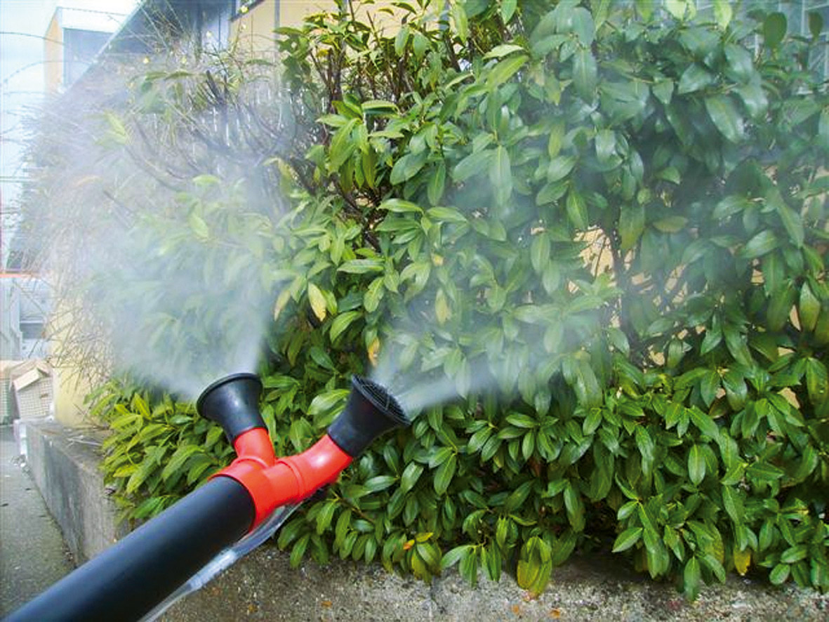Dvostruka mlaznica za raspodjelu mlaza prskanja, za istovremenu obradu dva reda jedne kulture, s dodatnim mlaznicama koje se mogu koristiti i u uskim redovima.