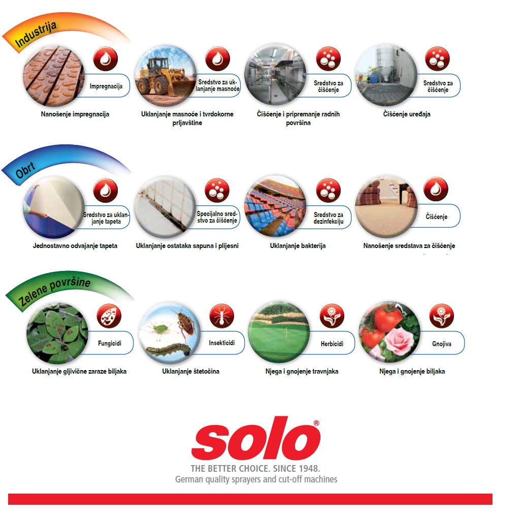 SOLO PROFI linija proizvoda. Proizvedeno u Njemačkoj! Spremnik 15,00 L Tlak prskanja regulirajući od 1 do 4 bara (sa čepom 6 bara) Težina 5,2 kg Klipna pumpa. Teleskopska cijev od 50 do 90 cm. Sustav za nošenje. Mlaznica podesiva mesing.