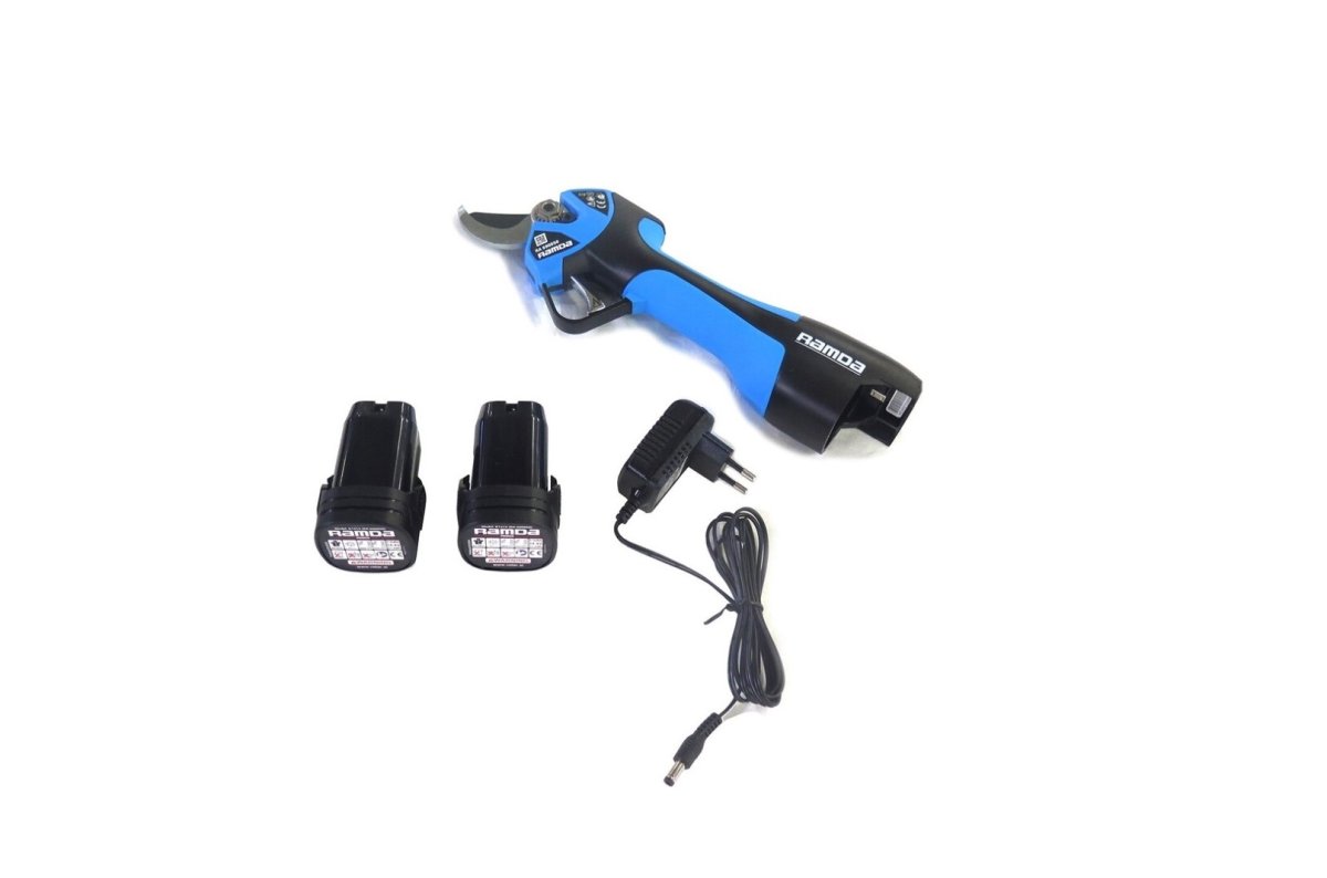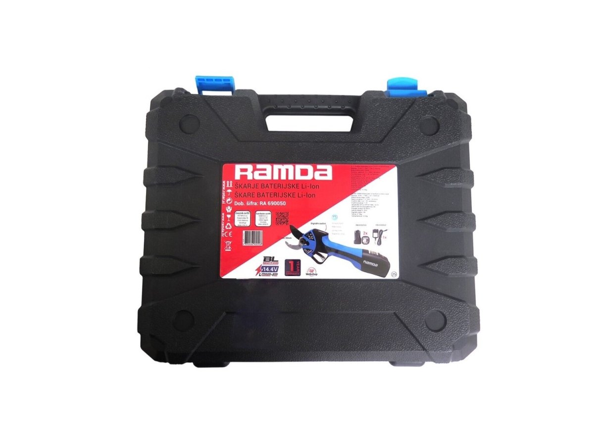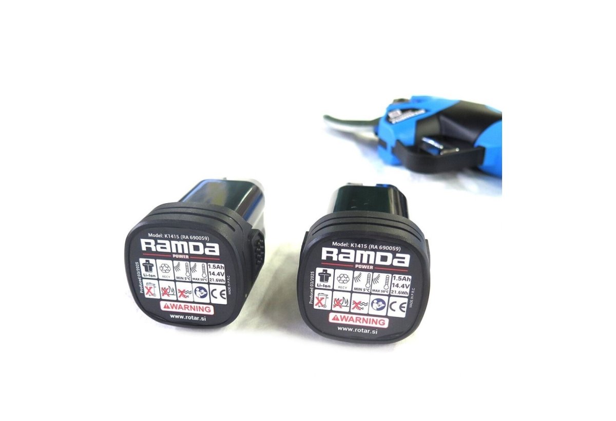 - Baterijske škare za rezidbu RAMDA. Set sa dvije baterije 1,5 Ah, punjačem, alatom i torbom za nošenje. Vrijeme rada: cca. 1-3h (JEDNE BATERIJE) Broj artikla: RA 690050