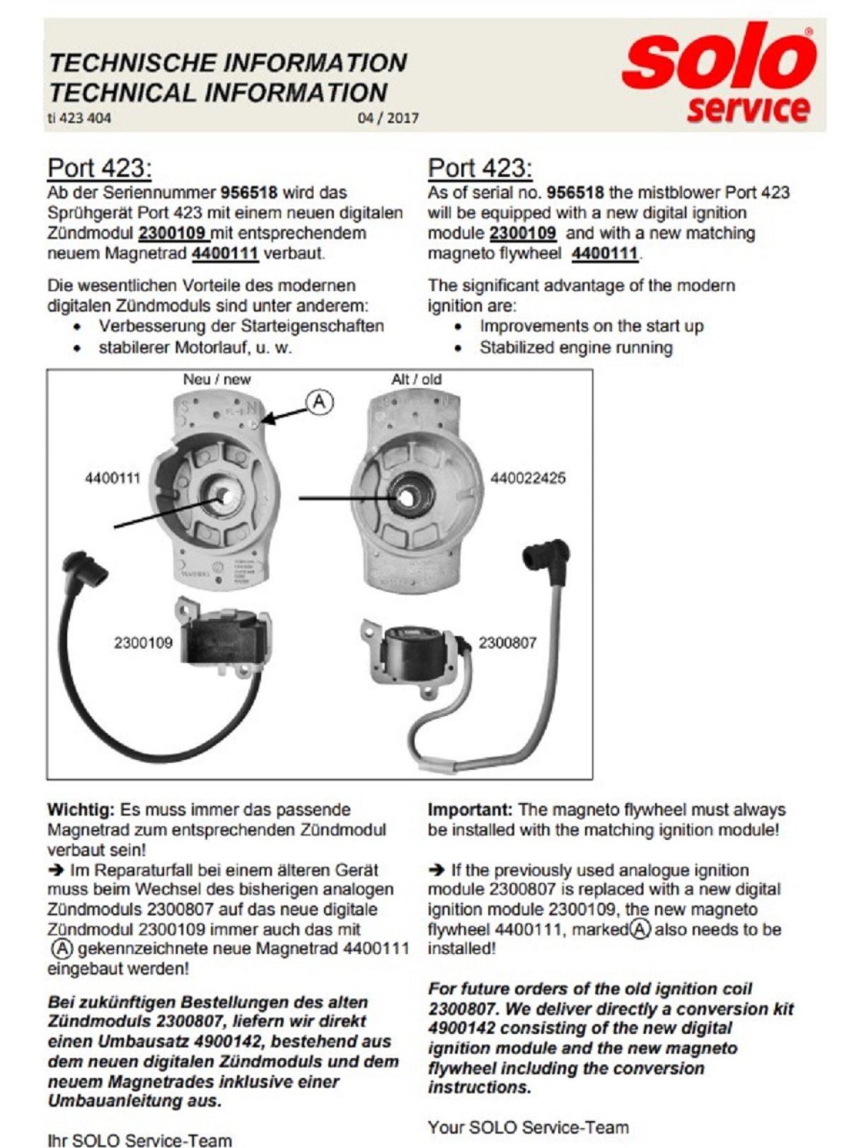 Set bobine i zamašnjaka SOLO 423 Port, proizvedeno između 1999. i 2014.